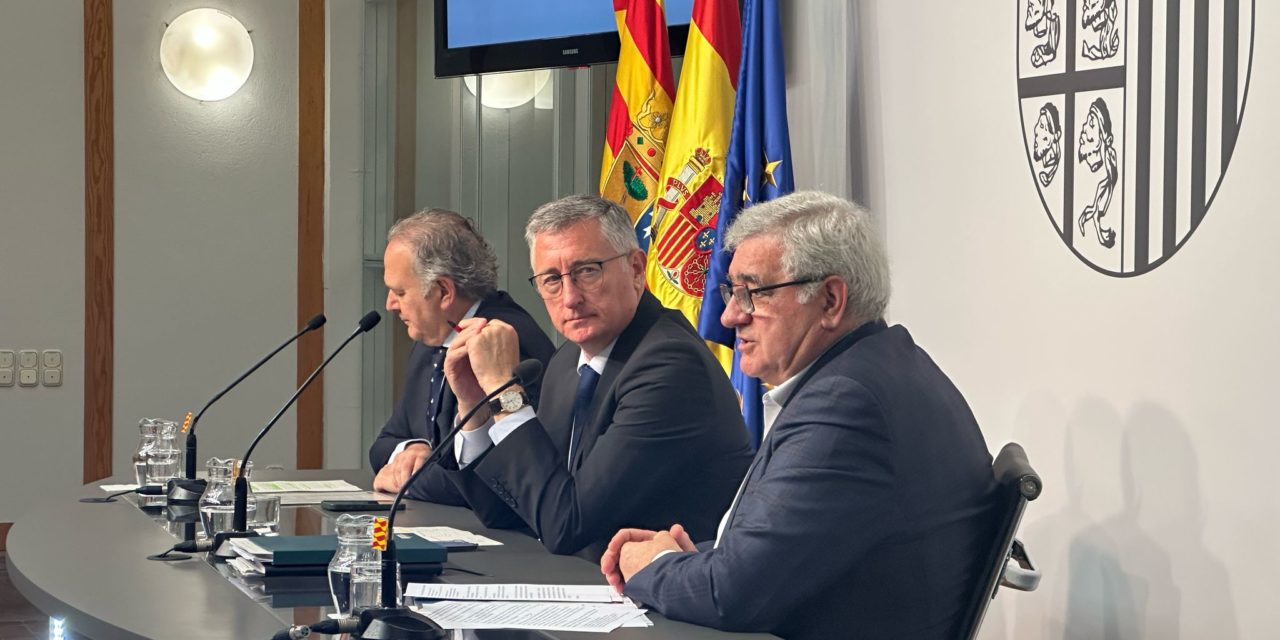 El consejero de Medio Ambiente y Turismo, Manuel Blasco; el director general de Turismo y Hostelería, Jorge Moncada; y el presidente de la Confederación de Empresarios de Hostelería y Turismo de Aragón, Fernando Martín, han presentado las líneas maestras de este documento.