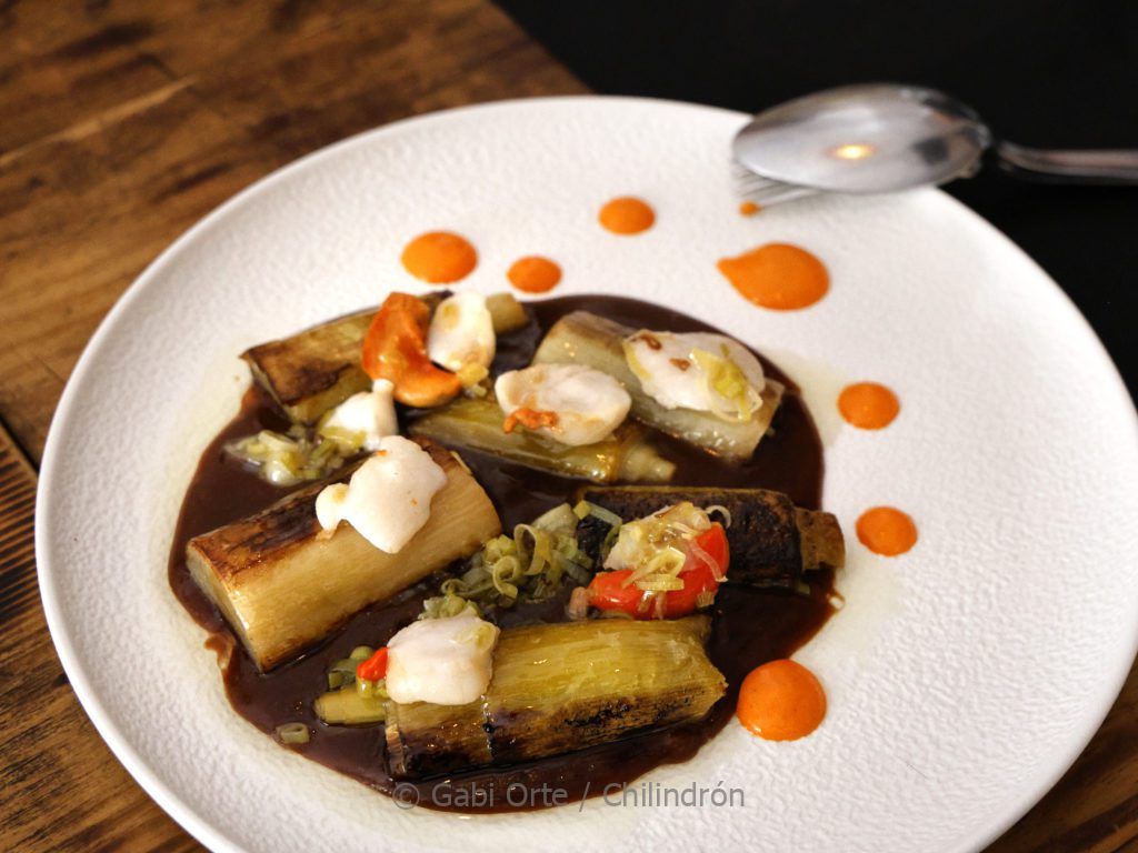 Puerros braseado de las Cinco Villas, salsa demi-glace, zamburiñas y emulsión de puerro asado, una de las especialidades de la casa. Foto: Gabi Orte Chilindrón,