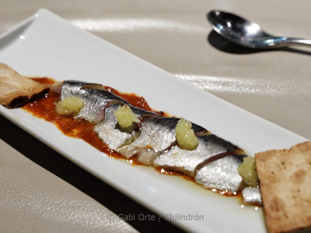Sardina de cubo sobre crema muhammara –siria de pimientos rojos asados–, cítricos y frutos secos, homenaje al abuelo de Raúl Igual. Foto: Gabi Orte Chilindrón.