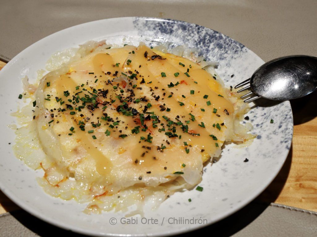 Tortilla a medio hacer con carpaccio de langostinos y salsa de su coral, inspirada en Sacha. Foto: Gabi Orte Chilindrón.
