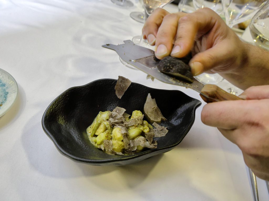 Alcachofas con carbonara y trufa natural, maridada con un albariño Casa Julia. Foto: Gabi Orte Chilindrón.
