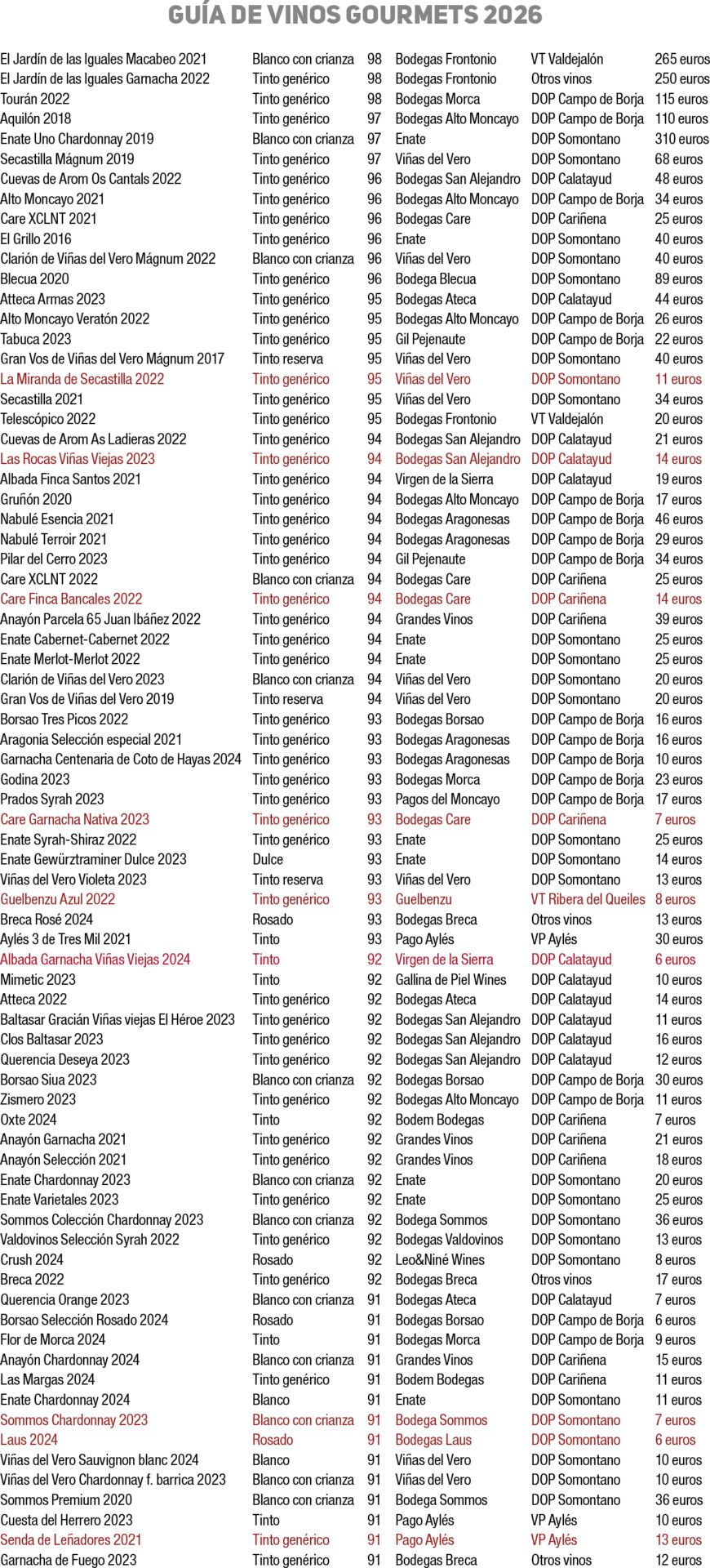 Seis vinos aragoneses –dos más que el año pasado– llegan a los 97 puntos en la Guía Vinos Gourmets 2026, en su XLI edición. Dos vinos de Frontonio –El Jardín de las Iguales, tinto y blanco–, y Touran 2022, de Bodegas Morca, encabezan las puntuaciones, seguidos por Auilón, de Bodegas Alto Moncayo, Enate Uno Chardonnay 2019, de Enate, y Secastilla Mágnum 2019, de Viñas del Vero.