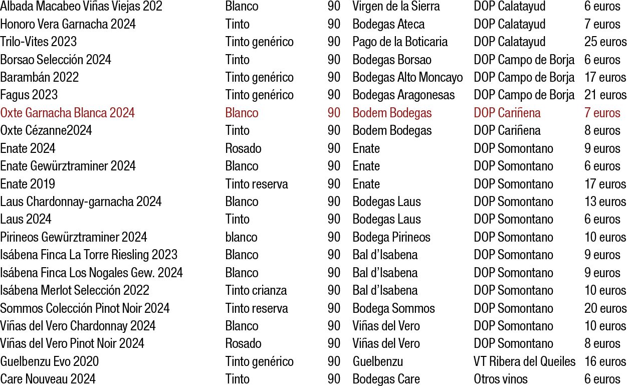 Por denominaciones, destaca la DOP Somontano, con 26 referencias seguida de Campo de Borja, con 18; Calatayud logra doce por diez de Cariñena. Vino de Pago Aylés introduce dos referencia y Vinos de la Tierra Valdejalón, dos, gracias a Frontonio.