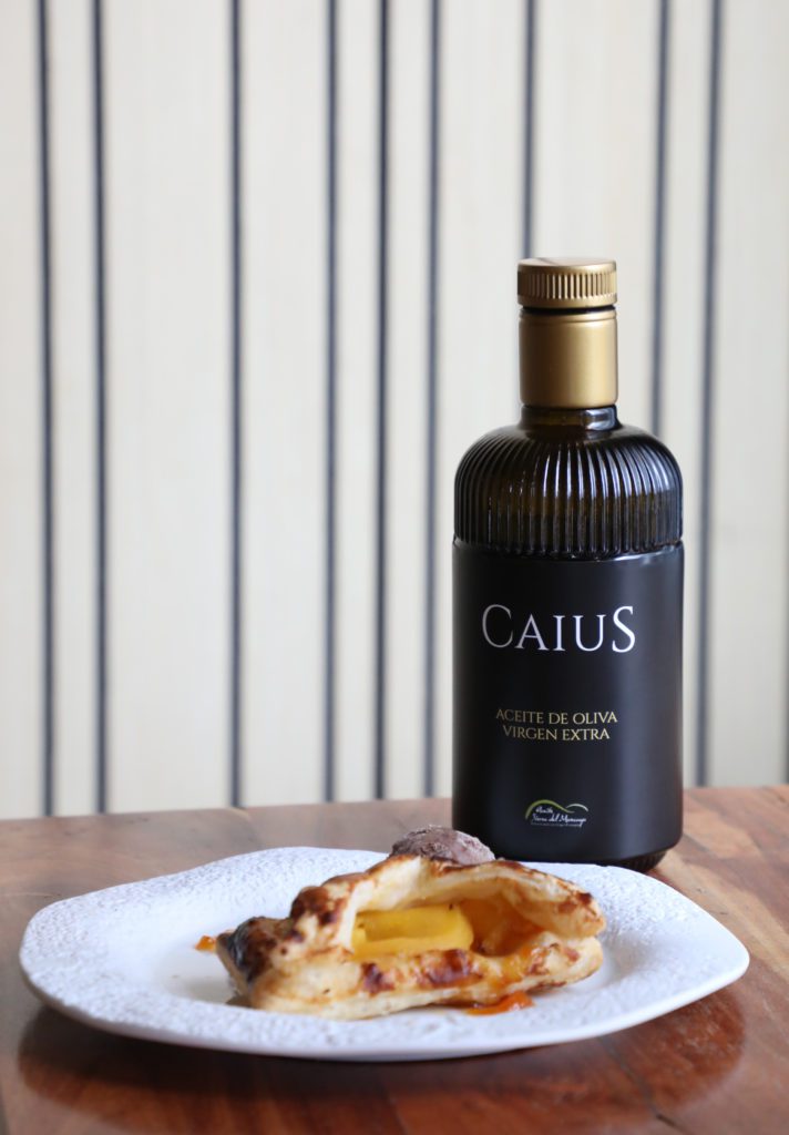 El toque dulce ha llegado de la mano de El Gastrónomo Gourmet y su AOVE premium Caius, elaborado también por la Cooperativa Santo Cristo de Magallón «con presencia mayoritaria de aceitunas arbequina y otras variedades minoritarias», como ha descrito Palacios. Sus frutados de aceituna verde, tomatera y almendras verdes y su amargor y picante bien equilibrados armonizan muy bien, ha resaltado el chef, con el “Hojaldre de melocotón de Calanda en almíbar con helado de chocolate y AOVE” con el que se ha puesto fin a esta fiesta de los nuevos aceites Sierra del Moncayo DOP.