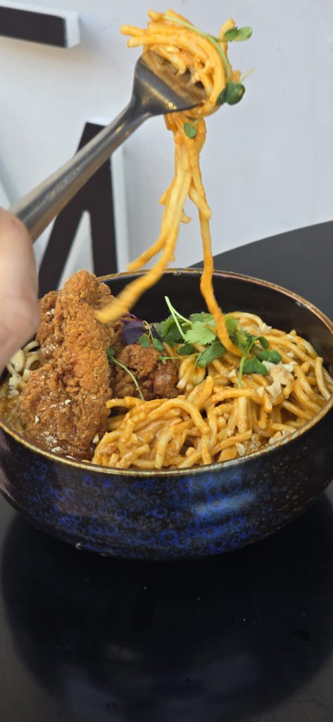 Coloridos noodles de pollo con salsa thai. Foto: Extrem.