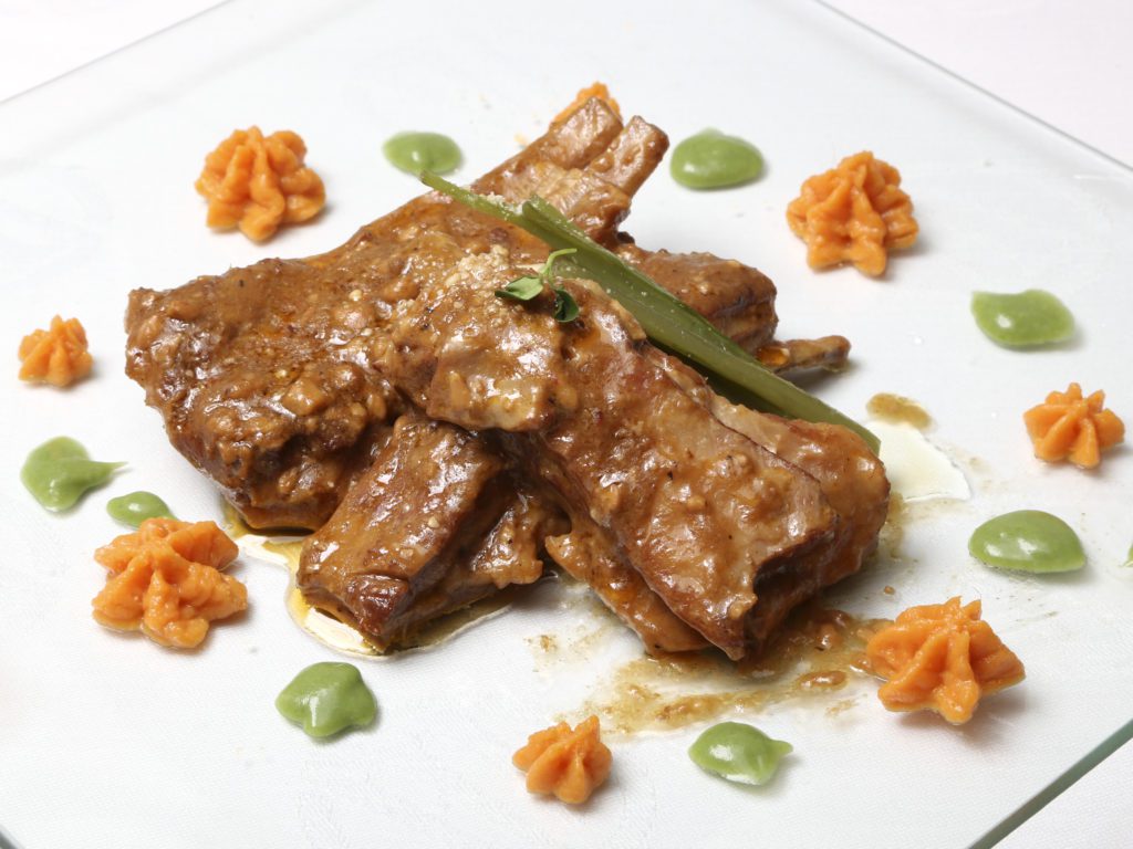 El plato premiado: un guiso de tajo bajo de Ternasco de Aragón IGP, con salsa de anacardos, acompañado con puré de boniato y de borraja. Foto: Almozara.