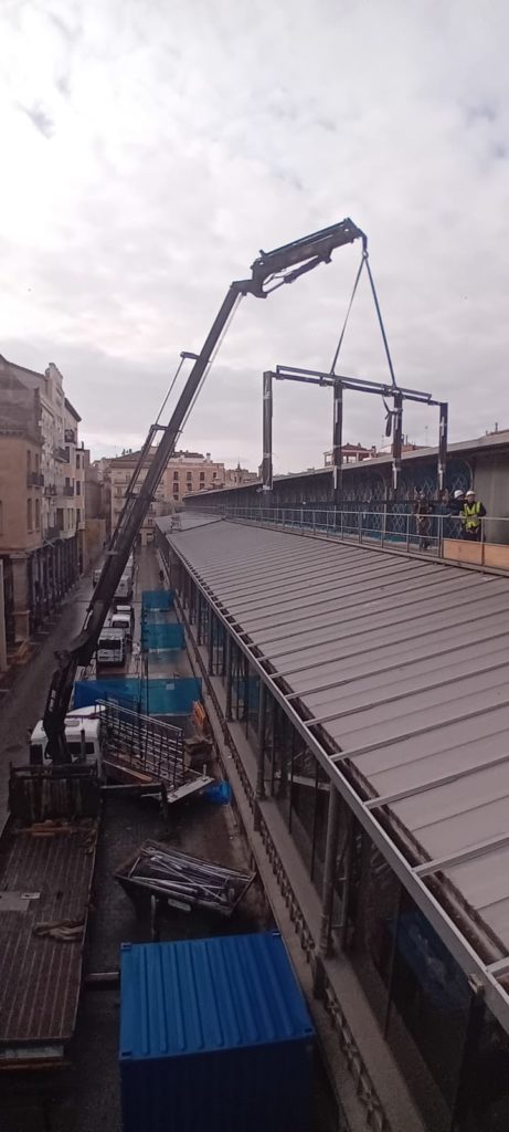 En el lateral del tranvía se colocará un andamio que dará acceso a la zona de trabajo y desde el que desmontar previamente las placas de metacrilato, remates metálicos y chapas antipájaros que ahora existen. Allí se repetirá el mismo proceso seguido en la fachada opuesta, una labor, eso sí, condicionada por la circulación del tranvía, que obligará a que las operaciones de elevación y montaje se realicen en horario nocturno, evitando interferencias con el servicio. Al igual que ha sucedido con el primer módulo de prueba, que no ha influido en la campaña de ventas navideñas, en los meses que dure esta fase constructiva, El Ayuntamiento de Zaragoza ha priorizado la minimización de afecciones para un desarrollo normal de la actividad de abastos, tanto para los detallistas como para los clientes del Mercado Central.