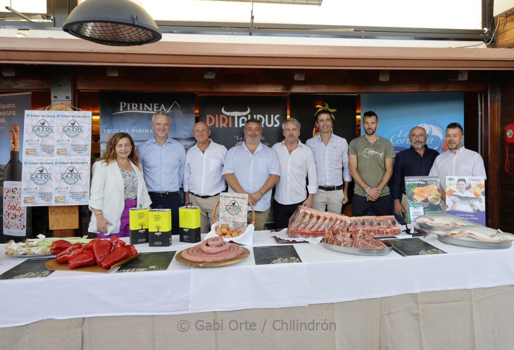 Los proveedores del menú aragonés –Frutas Cester, Pirinea, Borsao, Ternera Piritaurus, Huevos Gazol, La Coruñesa– con David Burillo justo en el centro. Foto: Gabi Orte Chilindrón.