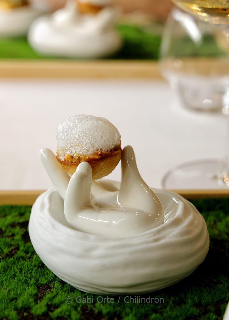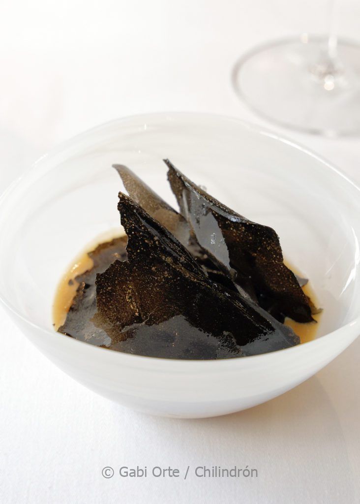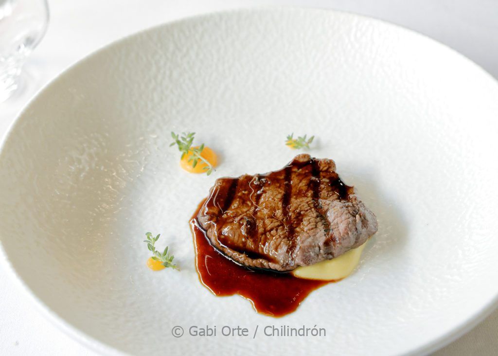 Sigue presente el mar, aunque ya apunta hacia la tierra, en el siguiente pase: Kokotxa, tupinambo, chimichurri y salsa de pollo y mantequilla, un producto muy querido por Baldrich, que juega con su melosidad. También presente en la Panceta duroc, hoisin, sopa agria y piparra, que llega con un intenso chupito. Conclusión más clásica con el Lomo de ciervo con ají y boniato, presentado en su justo punto.