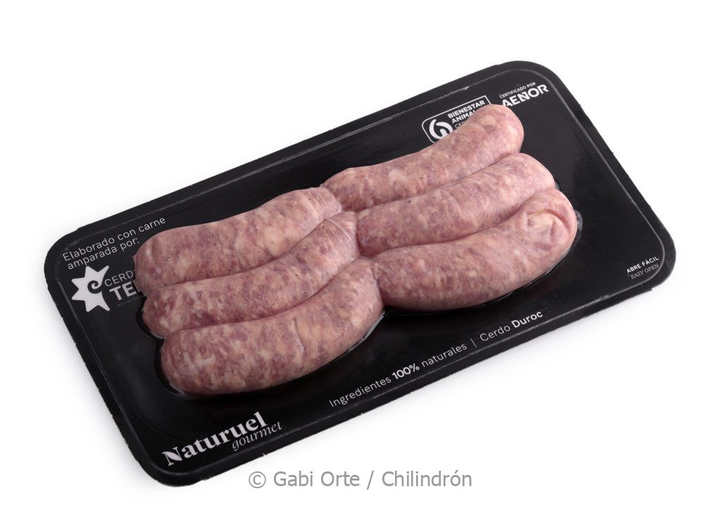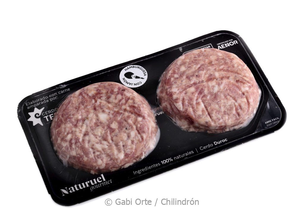 La hamburguesa que nos ocupa, de unos 240 gramos, refuerza su sabor gracias al jamón de Teruel, aunque también se ofrece al natural y con trufa. Resulta sabrosa y jugosa, gracias a la textura de la cebolla pochada, con el punto justo de grasa. Lo mismo sucede con sus salchichas, embutidas en tripa natural de ovino, seis en cada paquete, de 45 gramos cada una.