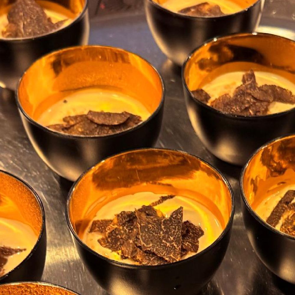 - Boulevardier: Puri Tuber: Pani puri clásico relleno de crema de trufa negra de Aragón con un velo de miel a la trufa y coronado con un demiglace de setas acompañado de un caldo de gallina trufada.