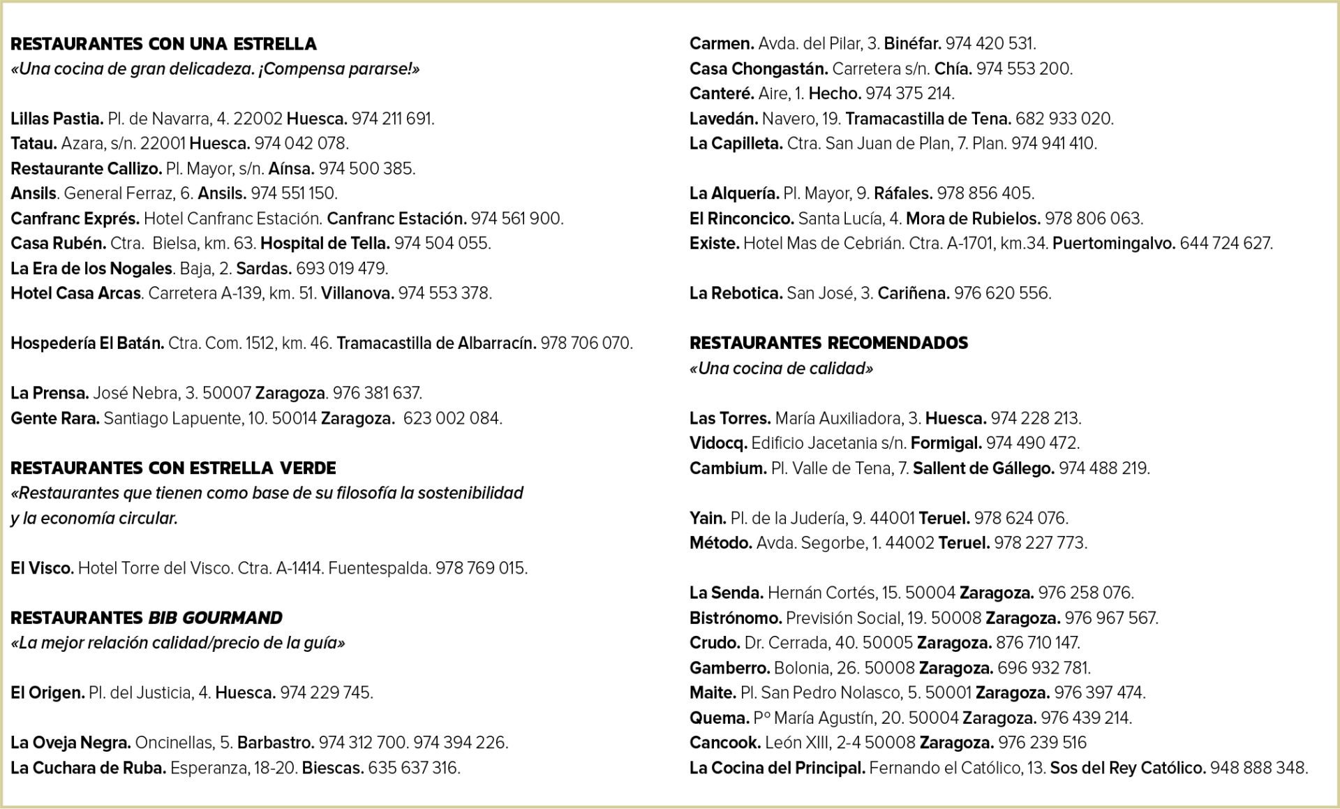 El número de estrellas se mantiene en once –ocho en Huesca, dos en Zaragoza y uno en Teruel– al perder el Cancook su distinción y también la estrella verde; si embargo, y a pesar de estar cerrado actualmente, se mantiene como recomendado.