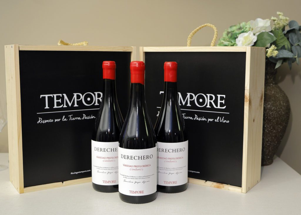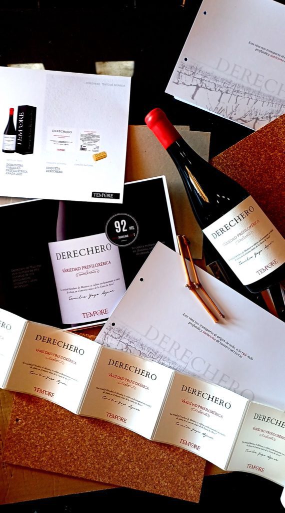 Este proyecto surgió hace ya más de una década de los estudios realizados por el Centro de Transferencia Agroalimentaria (CTA) de Aragón para la recuperación de variedades minoritarias aragonesas. En sus inicios, la plantación experimental de esta variedad tan particular tenía una superficie de 1.5 hectáreas y, en estos momentos, cuenta con 3 hectáreas. Es decir, tras años conociendo el viñedo y su potencial, desde Bodegas Tempore se ha apostado por duplicar la variedad tanto en la población zaragozana de Lécera, donde está ubicada la bodega, como en la de Muniesa, de donde es oriunda la variedad derechero. La referencia Derechero de Muniesa está clasificada como Vinos Especiales de Tempore e incluida en la IGP Bajo Aragón.