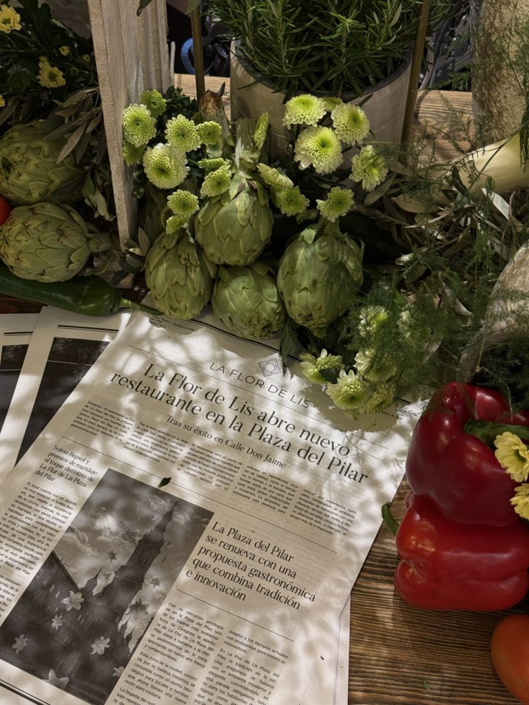 El producto local es el verdadero hilo conductor de la carta de La Flor de Lis. Ingredientes como la borraja o la alcachofa se trabajan desde una mirada actual, respetando su esencia pero llevándolos un paso más allá en cada elaboración. Platos como el ya famoso Tataki Baturro o las alcachofas fritas con crema de jamón de Teruel y corteza de cerdo reflejan una cocina que parte del territorio para construir una experiencia contemporánea, reconocible y llena de matices.