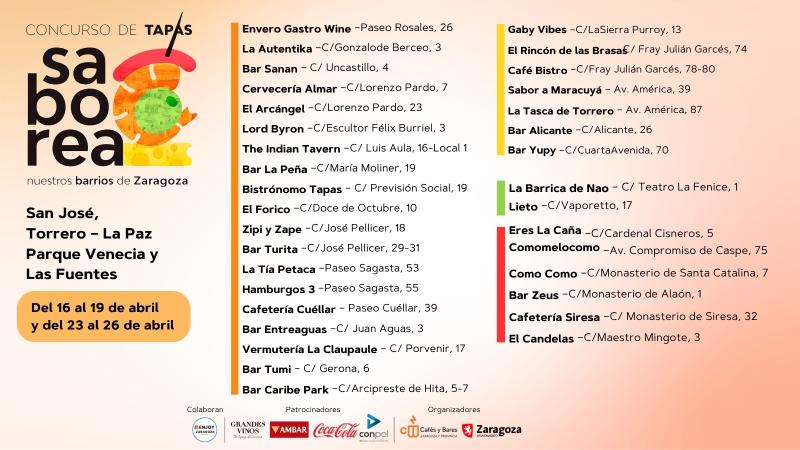 La organización del Ayuntamiento de Zaragoza y de Cafés y Bares cuenta con el patrocinio de Conpol, Grandes Vinos, Cocacola y Ambar. A ello, se suma el esfuerzo por respaldar anualmente esta iniciativa de las distintas Juntas Municipales y juntas vecinales, de las asociaciones de vecinos y las asociaciones de comerciantes.