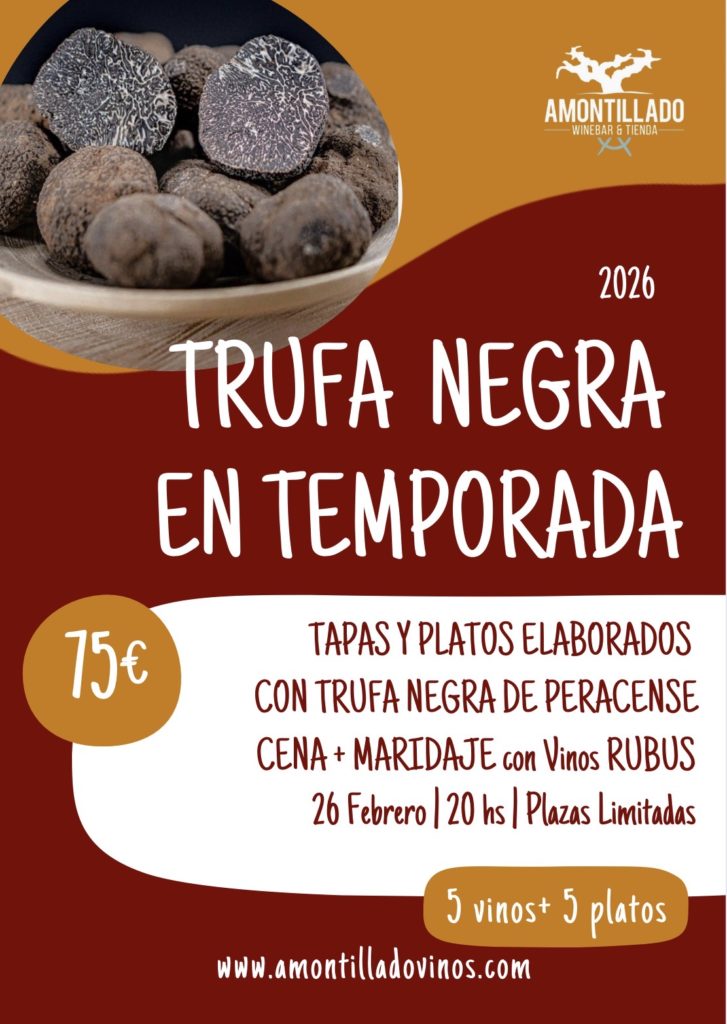 Amontillado Wines & tienda –Hermanos García Mercadal, Local 5. 50009 Zaragoza. 976 876 793– propone una cena con trufa negra de Peracense, maridada con los vinos Rubus. Por 75 euros, el jueves, 26 de febrero, a las 20 horas.