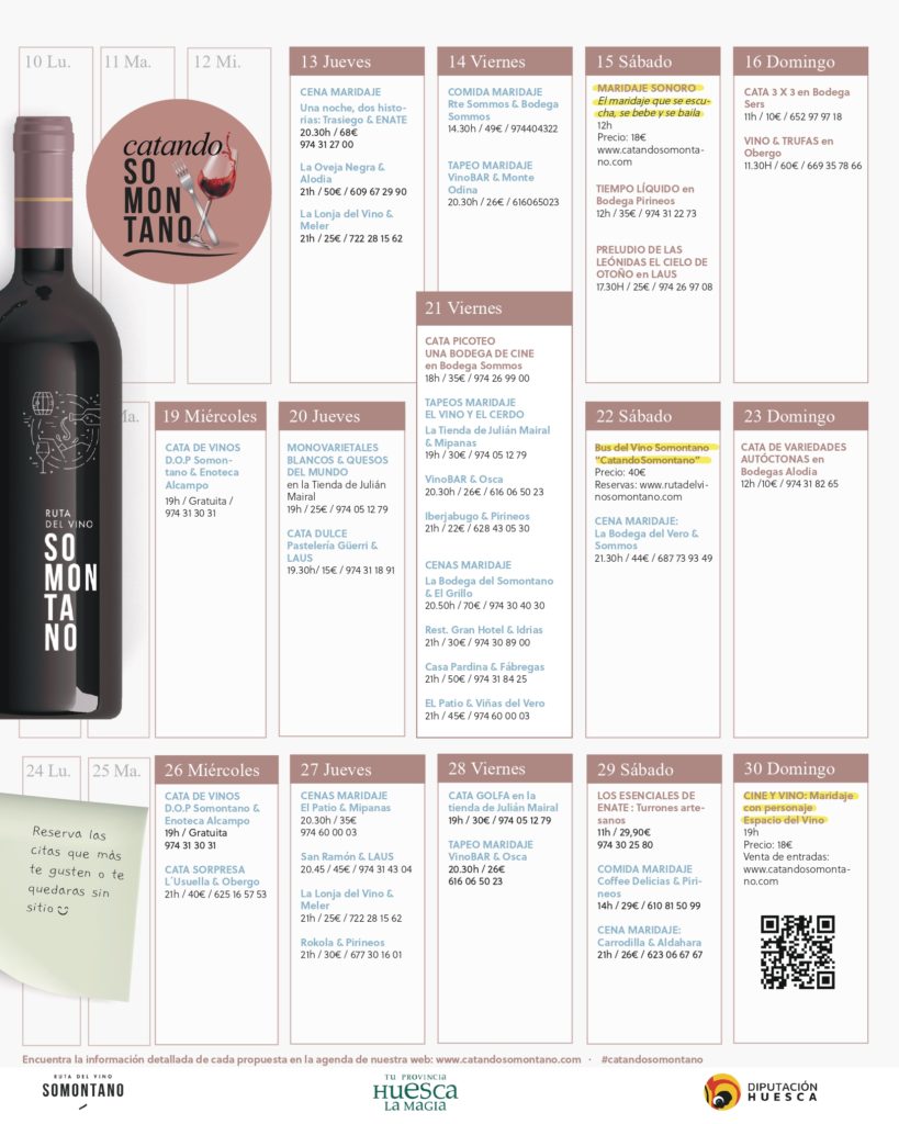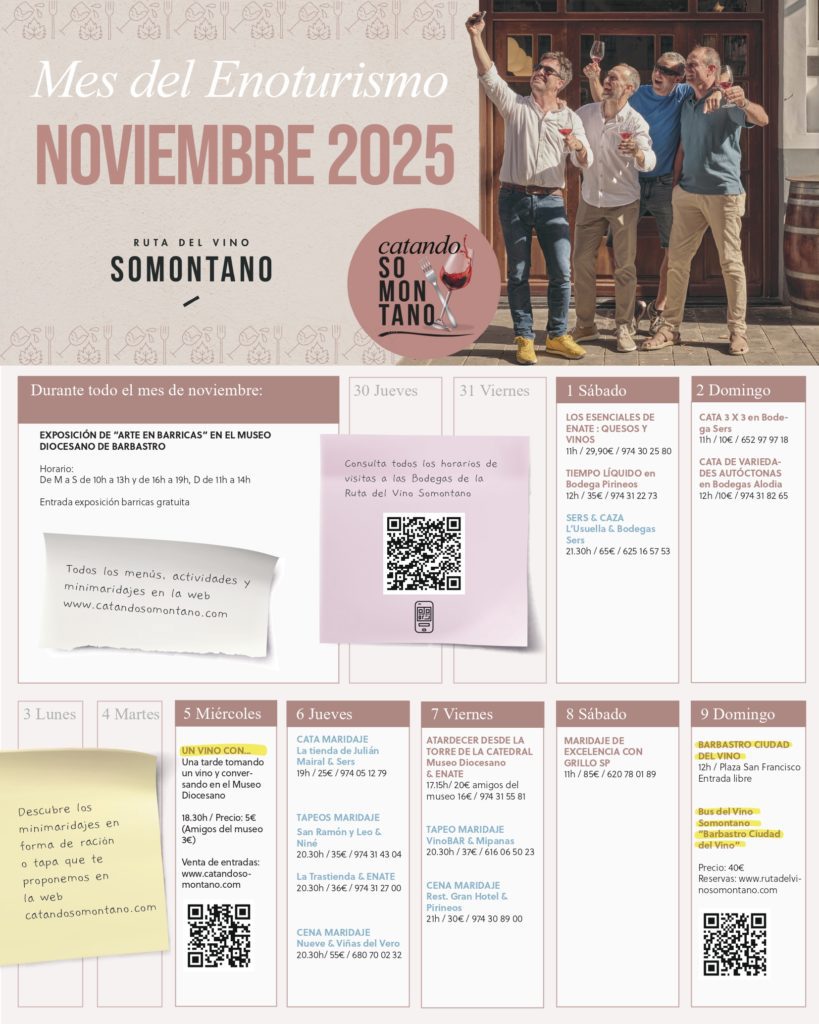 Unas 40 propuestas para disfrutar de la cultura del vino y el maridaje: Maridajes de gastronomía y vino, Maridaje Sonoro, Barbastro Ciudad del Vino, Minimaridajes, atividades en bodega, catas…las citas se suceden a lo largo de todo el mes.