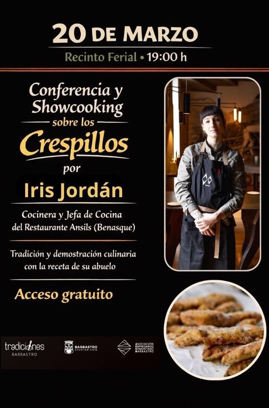 Antes, el viernes, 20, la jefa de cocina del Restaurante Ansils de Benasque, la barbastrense Iris Jordán,. ofrece una conferencia a las 19 horas en el Recinto Ferial que incluirá un showcooking en el que preparará crespillos según la receta de su abuelo. “