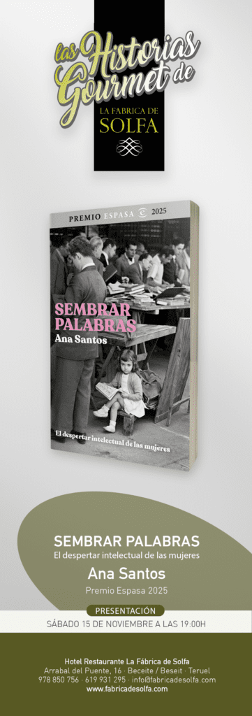 El  hotel La Fábrica de Solfa −Arrabal del Puente, 16. Beceite 978 850 756− presenta el próximo sábado, 15 de noviembre, a las 19:30 h, dentro del ciclo cultural Historias Gourmet, el libro Sembrar palabras. El despertar intelectual de las mujeres, de Ana Santos.