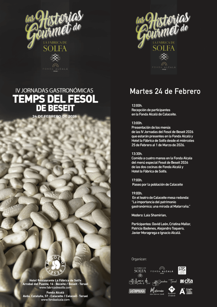 El restaurante hotel La Fábrica de Solfa −Arrabal del Puente, 16. Beceite 978 850 756 / 619 931 295− y la Fonda Alcalá, de Calaceite, presentan las IV Jornadas gastronómicas de los ‘Fesols de Beseit’, dentro del marco de Las Historias Gourmet de La Fábrica de Solfa.