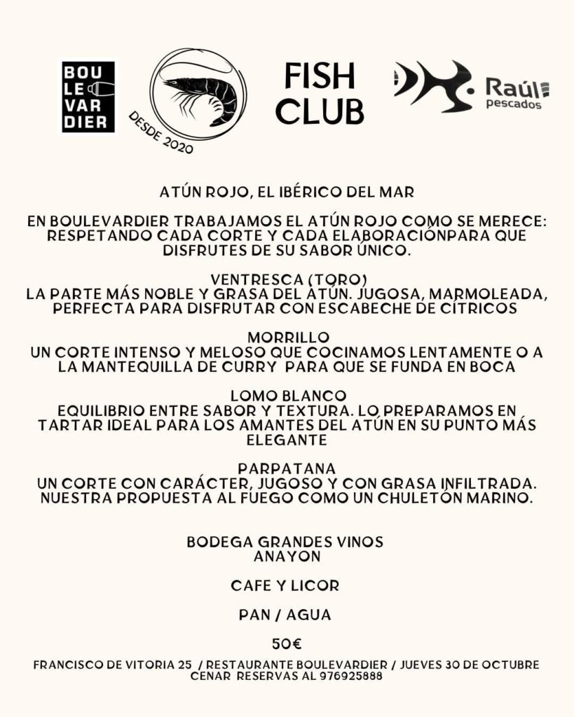 Boulevardier Restaurante –Doctor Horno Alcorta, 26. 50004 Zaragoza. 976 925 888– propone la cena Fish Club, Atún rojo, el ibério del mar, mcaridaje con Anayón, de Grandes Vinos Por 50 euros, que incluyen la bodega, cafè, licor, panes y agua.