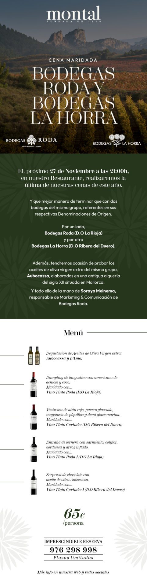 Montal –Torre Nueva, 29. 50003 Zaragoza. 976 298 998– propone una cena maridada con Bodegas Roda y La Horra.