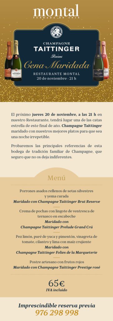Montal –Torre Nueva, 29. 50003 Zaragoza. 976 298 998– propone una cena maridada con champagne Taittinger.