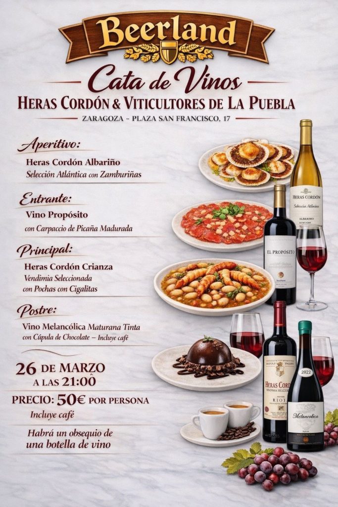 Beerland –Pl. San Francisco, 17. 976 560 603– ofrece una Cata maridada con Heras Cordón & Viticultores de La Puebla. Incluye una botella de vino como onsequio.