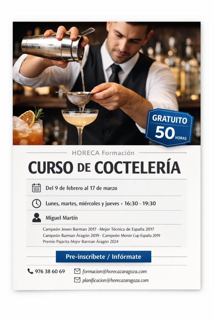 Profesor: Miguel Martín. Campeón Joven Barman 2017. Mejor técnica de España 2017. Campeón Barman Aragón 2019. Campeón Monin Cup España 2019. Premio Pajarita Mejor Barman Aragón 2024