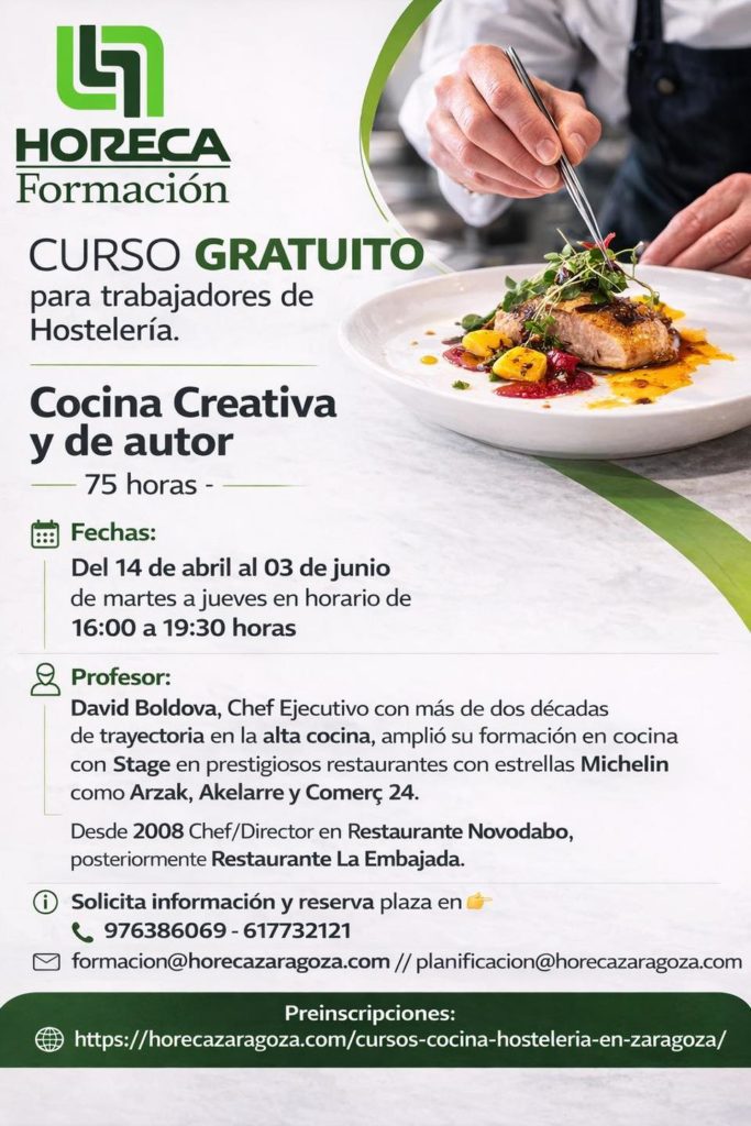 Cursos gratuitos de hostelería para trabajadores en HORECA FORMACIÓN. Comienzo en abril Desde HORECA Formación lanzan varios cursos gratuitos para trabajadores. información y reserva plaza en el 976 38 60 69 formacion@horecazaragoza.com + Añadir Google Calendar Exportación + iCal Tags:alérgenos, cocina aragonesa, Cocina Vegana, Cocina vegetariana, Formación para hostelería, Horeca, Horeca formación Fecha 15 abril, 2026 Hora All Day Precio Gratuito Etiquetas Zaragoza Localidad Zaragoza Zaragoza, España Categoría Cursos y talleres de cocina Zaragoza Compartir este evento