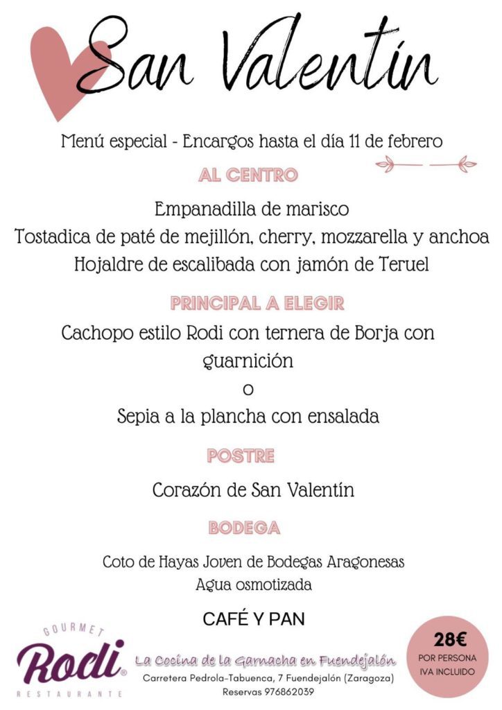 El Bar-Restaurante Rodi –Ctra. de La Almunia, s/n. Fuendejalón. 976 862 039– ofrece su menú de san Valentín, por 28 euros, incluido pan, agua, vino y café, el sábado, 14 de febrero.
