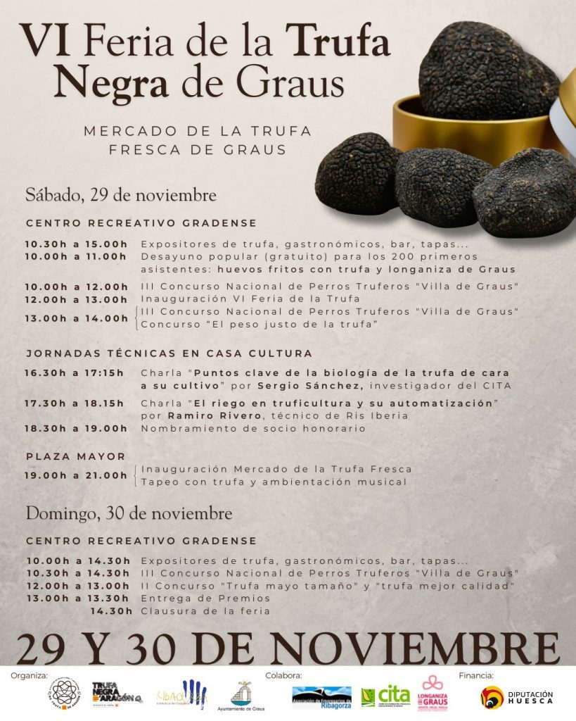 La VI Feria de la Trufa Negra de Graus se celebrará el último fin de semana de noviembre y coincidirá con la primera fecha del Mercado de la Trufa Fresca de Graus que tendrá lugar el sábado 29 de noviembre de 19 a 22 horas en el local de la Truficultura, en la Plaza Mayor.