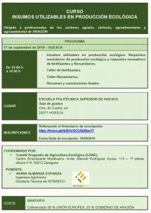 Organizado por el Comité Aragonés De Agricultura Ecologica, Curso de formación en insumos utilizables en producción ecológica en Huesca, el martes, 17 de septiembre, de 10 a 14 horas, gratuito. Puedes inscribirte aquí.