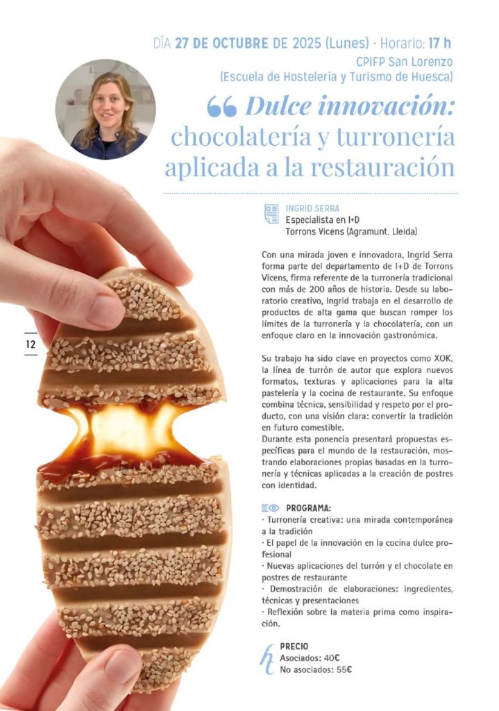 Dentro de los talleres Huesca, la Magia de la Gastronomía, el lunes, 27 de octubre a las 17 horas, Ingrid Serra, Especialista en I+D, Torrons Vicens (Agramunt, Lleida). Dulce innovación: chocolatería y turronería aplicada a la restauración.