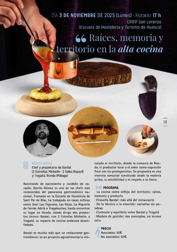 Dentro de los talleres Huesca, la Magia de la Gastronomía, el lunes, 3 de noviembre a las 17 horas, Benito Gómez, Raíces, memoria y territorio en la alta cocina.