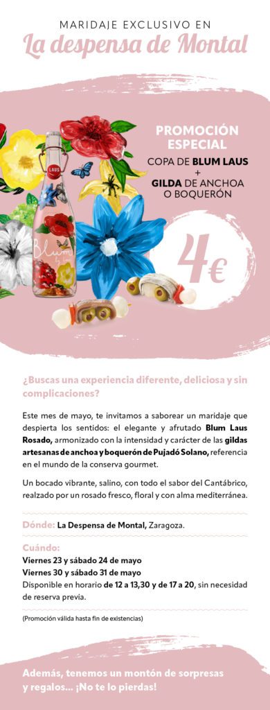Montal –Torre Nueva, 29. 50003 Zaragoza. 976 298 998– propone copa de Blum Laus y gilda, por 4 euros. Viernes y sábado, 30 y 31 de mayol de 12 a 13.30 y de 17 a 20 horas.