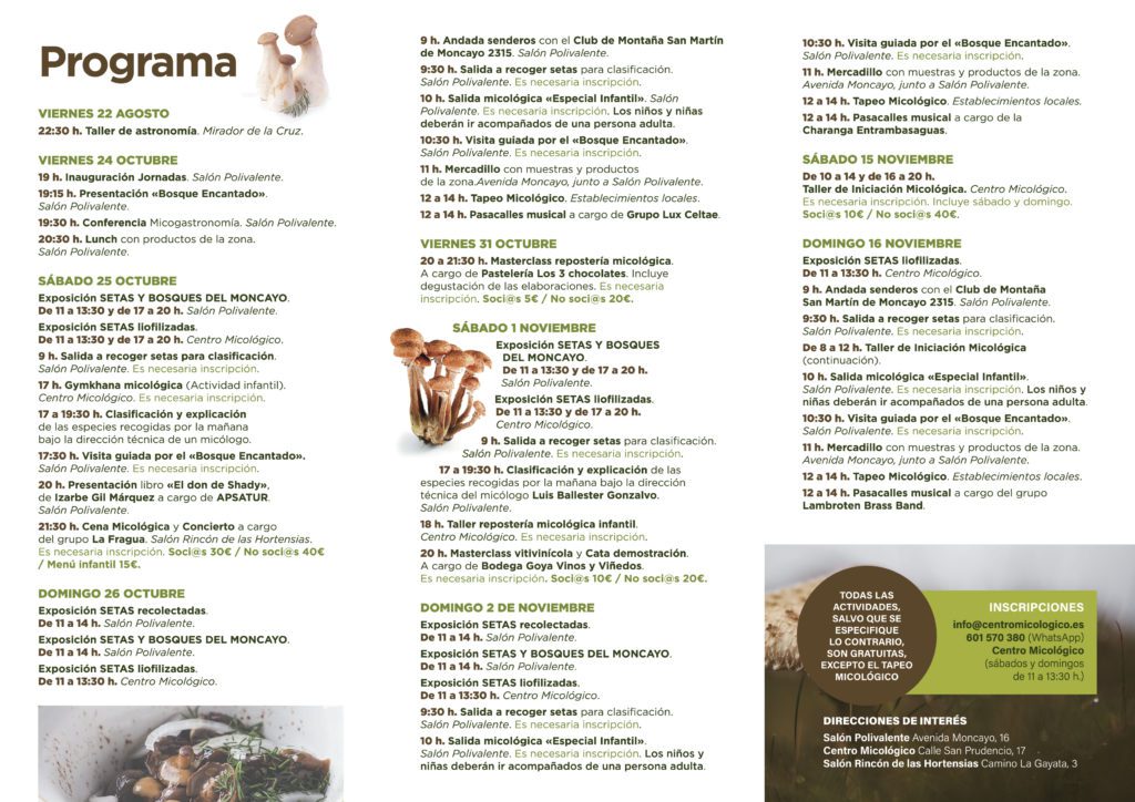 Dentro de la programación hay salidas al campo, talleres de cocina, clasificación de especies, mercadillos de productos de la zona, actividades para niños, cenas micológicas, etc.