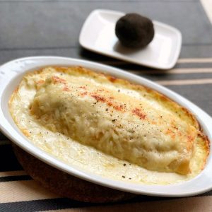 Canelón de longaniza de Graus con bechamel ligera, virutas de quesos del Bajo Aragón y trufa negra