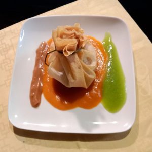 Saquito de manitas trufadas: Pasta brick rellena de manitas de cerdo, frutos secos