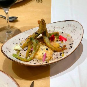 Flor de crespillos de borraja salada, con emulsión de Tuber melanosporum