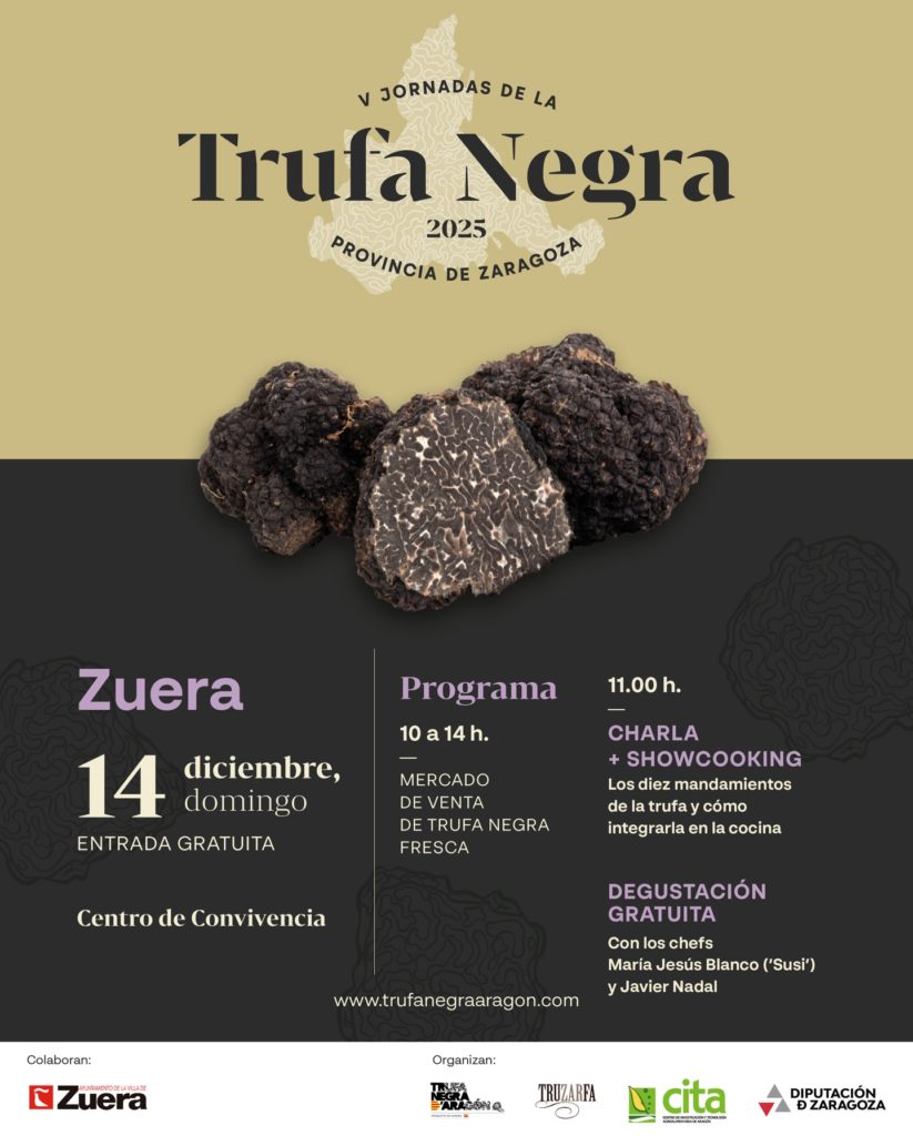 Zuera acoge el domingo, 14 de diciembre, una sesión de las V Jornadas de Trufa Negra de la provincia de Zaragoza, que financia la Diputación de Zaragoza , organizado por la asociación Truzarfa en colaboración con el Centro de Investigación y Tecnología Agroalimentaria de Aragón, CITA.